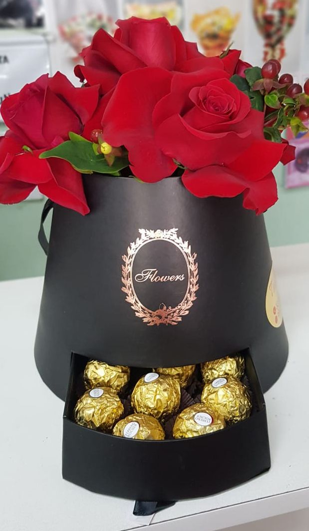 048- Cachepô com arranjo cde rosas vermelhas e gaveta com bombons ferrero rocher